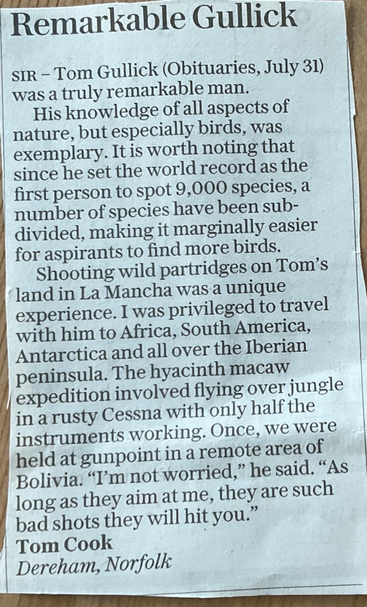 Gullick's birding career began not in his family home in Margate, Kent, but, soon after the outbreak of the 1939-45 war, when his prep school was evacuated to North Wales.