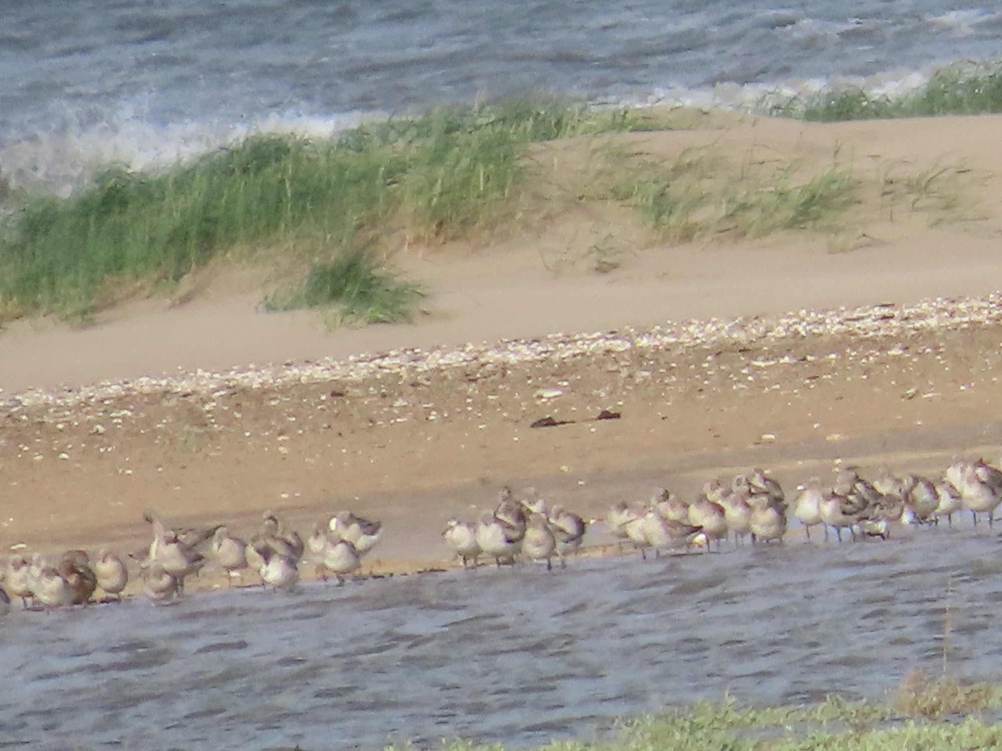 Hard to be sure without a scope but I think most were knot with a few godwits (or the other way round). A ringed plover also flew past.