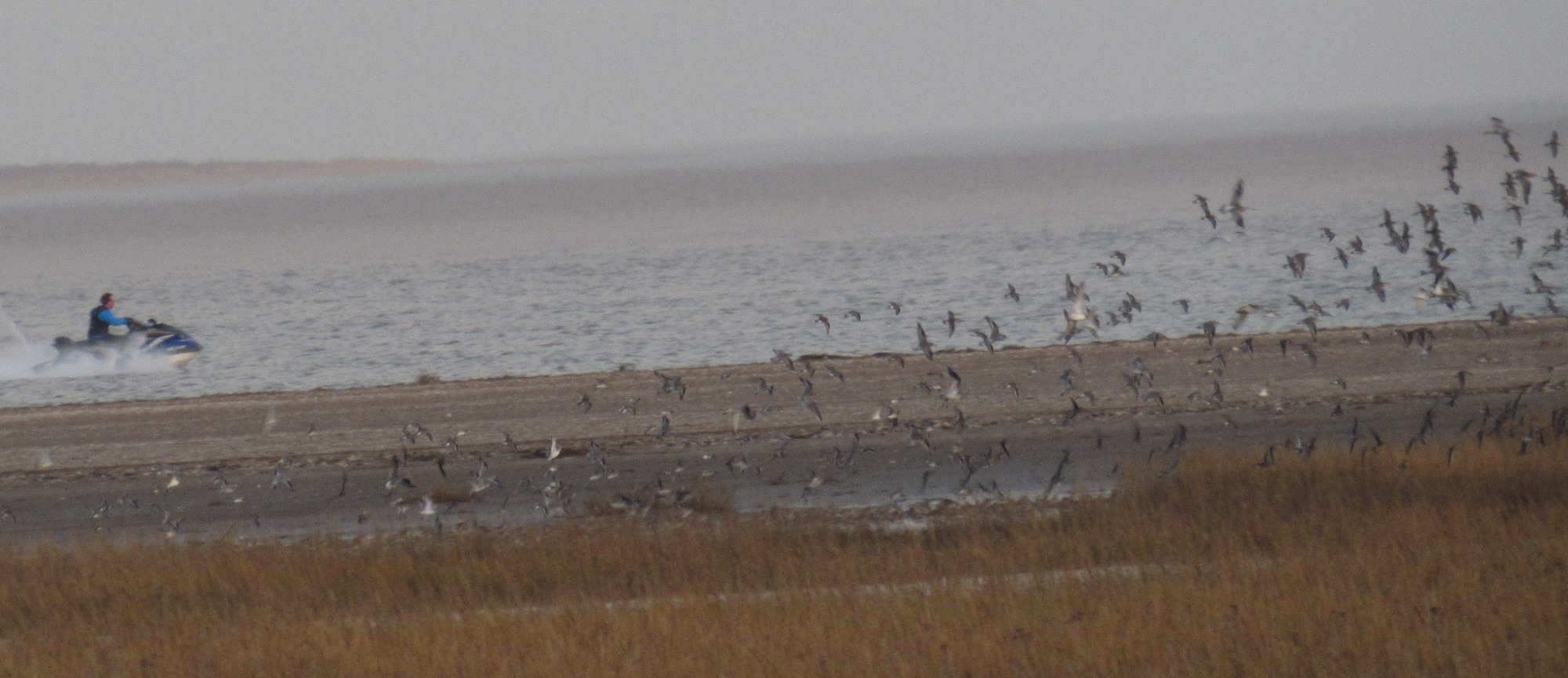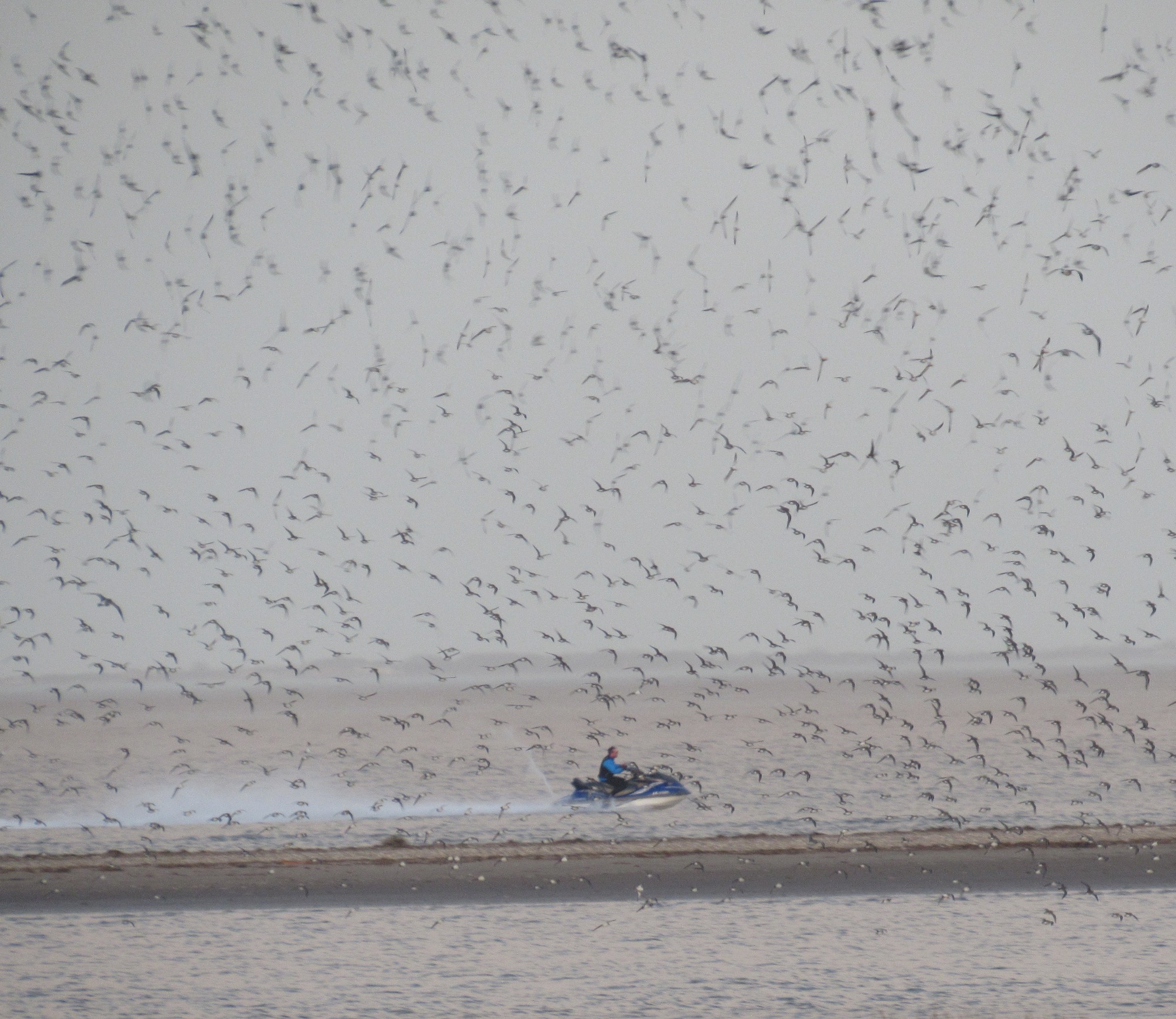 However, re impact on shorebirds, the jet-skiers are another matter when they venture beyond the yellow buoys (which they regularly do) towards the shorebird roost. They also pose a danger to other water users, especially wild swimmers.