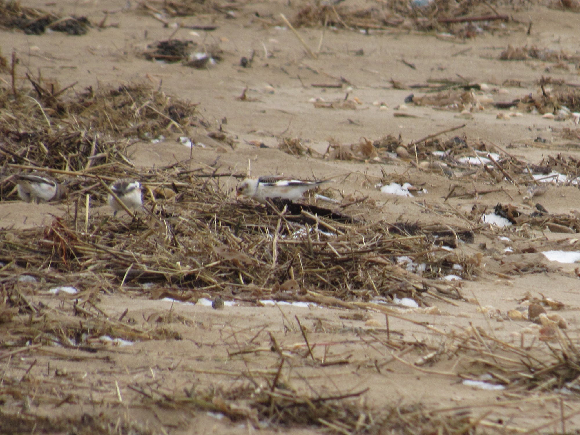 Four well-camouflaged snow buntings feeding on Cleethorpes outer beach tideline late morning today.
